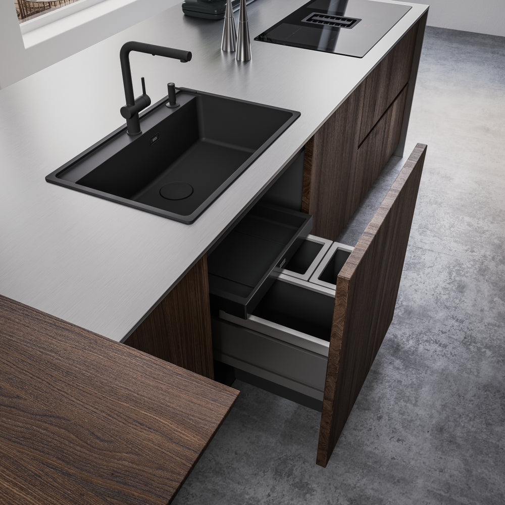 Sorter FX kommer med 3 separate affaldsspande – én stor på 26 liter og to mindre på 11 liter hver. Det giver dig fleksibilitet til at adskille restaffald, plast, papir eller andre fraktioner direkte under køkkenbordet.