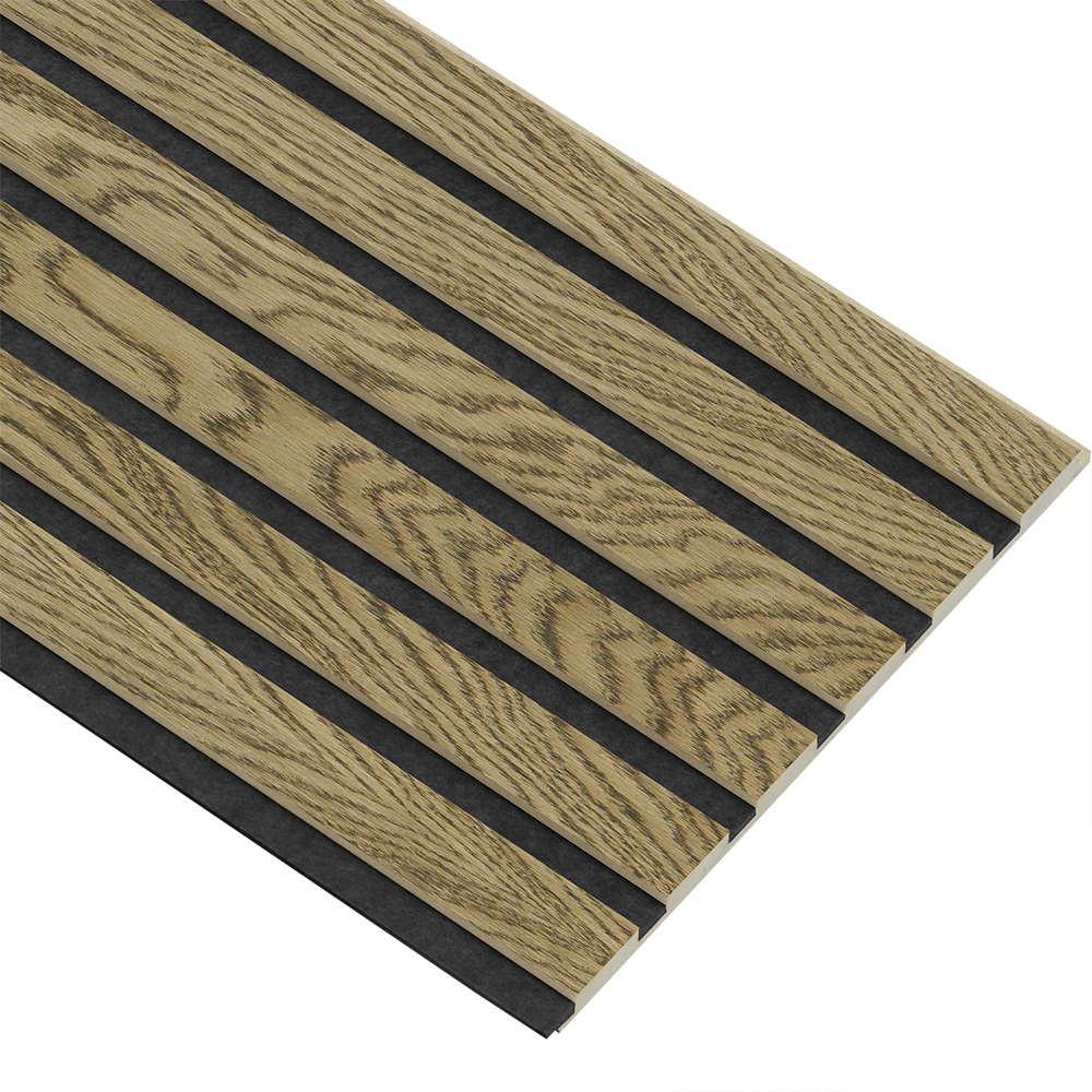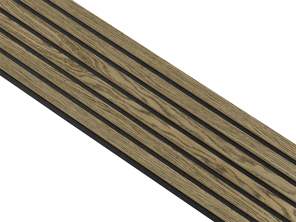 Akustikpaneler i almindelig kerne i mørkebrun oliering - vælg mellem forskellige farve filt - Mål: 16 × 300 × 2780 mm - Sort filt er i restordre og sendes så snart den er på lager igen.