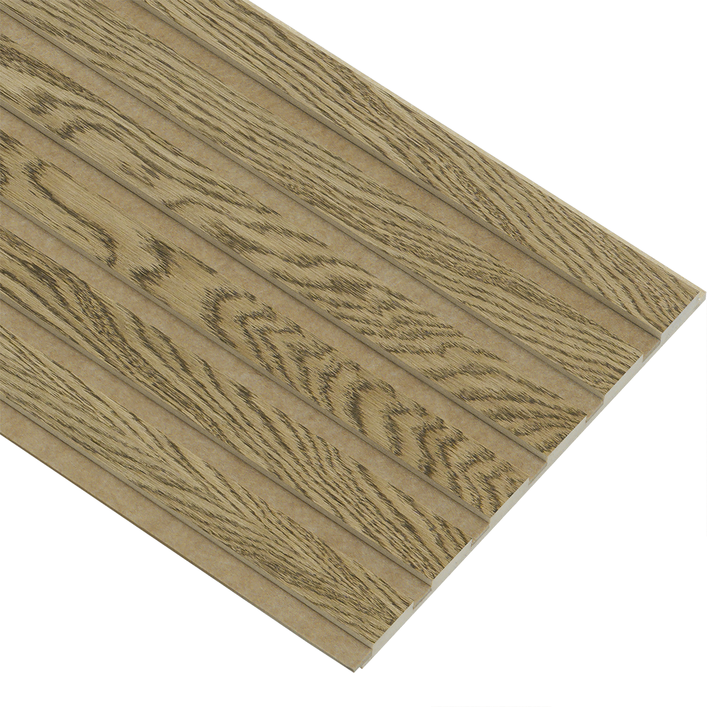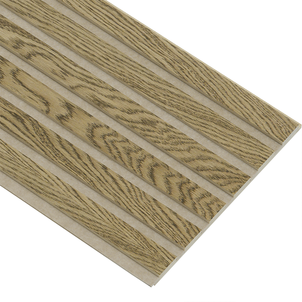 I-Wood Basic akustikpanel i MDF med egefinér og almindelig kerne. Panelet er mørkebrunolieret for at skabe en varm og eksklusiv finish. Den beige filt tilfører en blød kontrast, som passer perfekt til nordiske og lyse indretninger.