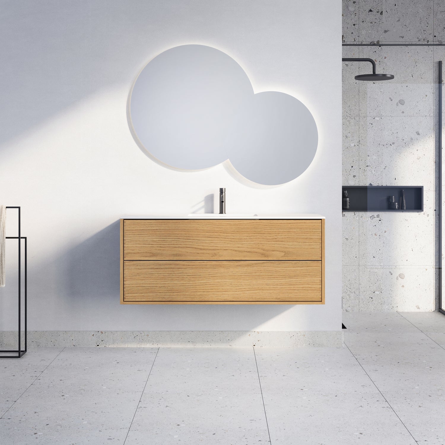 Nordic snedker vaskeskab i Natur lakeret eg med Reno solid surface badbordplade i bredde 120 cm med hanehul