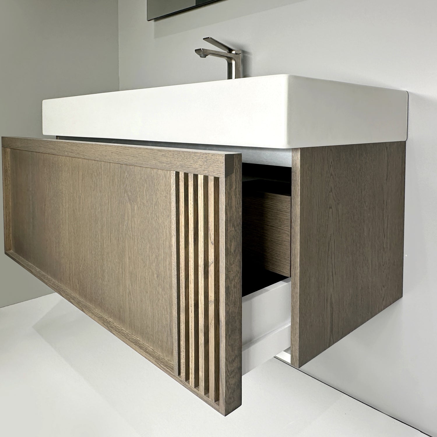 Dette elegante vaskemøbel fra Nordskab kombinerer moderne design, naturlige materialer og høj funktionalitet. Skabet er udført i smuk røget eg finér, som tilfører varme og eksklusivitet til badeværelset, mens den matte porcelænsvask fuldender det stilrene og minimalistiske udtryk.