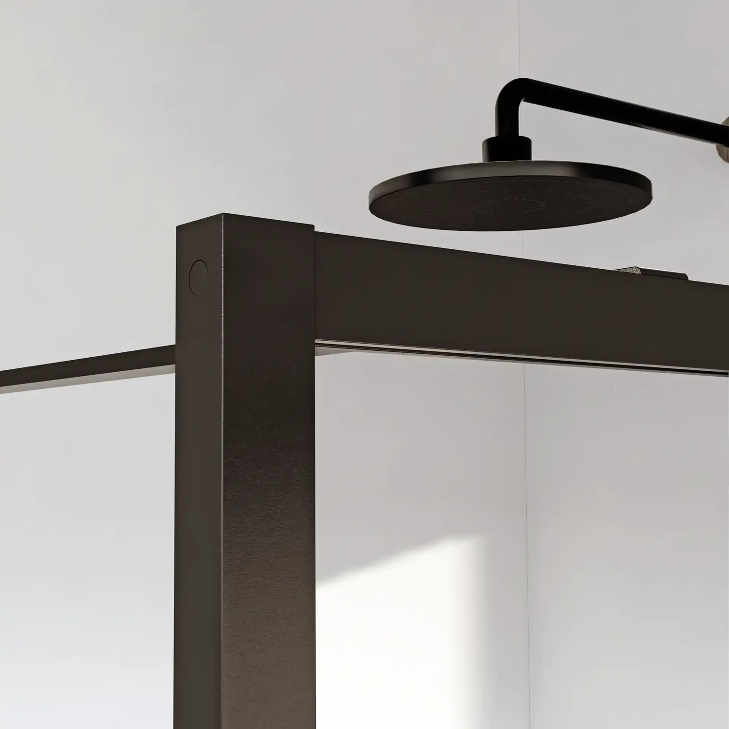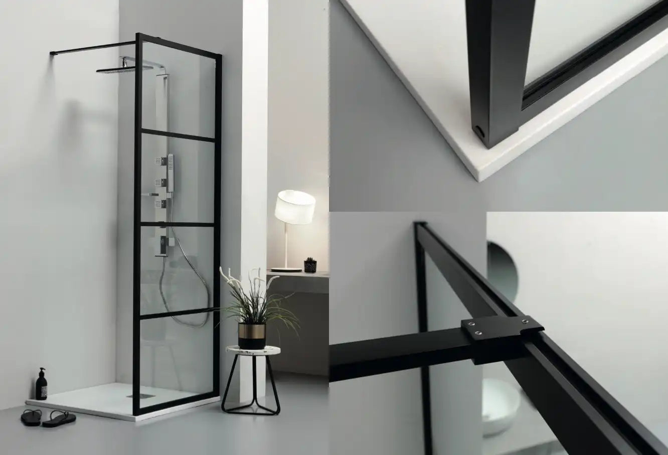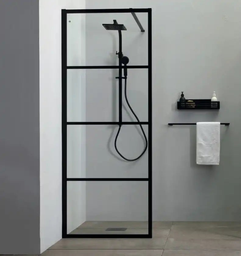 Walk-In fast bruseafskærmning i mat sort med vandrette sprosser på den udvendige side. Indvendigt er glasset plant for nem rengøring.