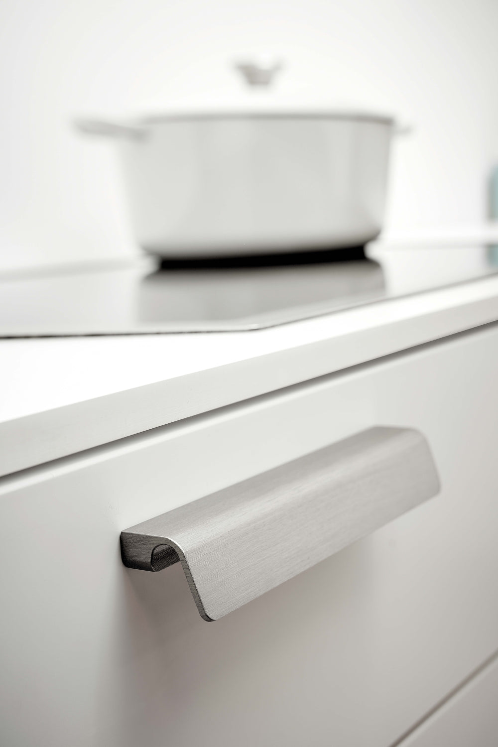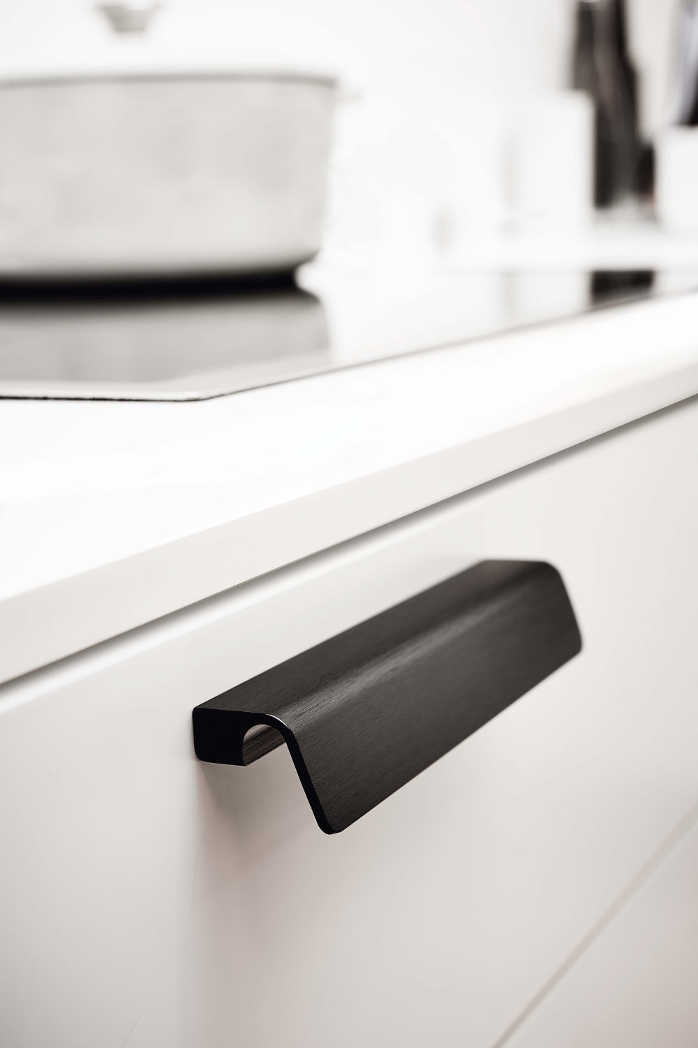 Fringe er en moderne skandinavisk fortolkning af de gamle industrielle greb, vi kender fra funktionelle møbler i f.eks. gamle værksteder og arkiver. Som navnet antyder er Fringe designet, så grebet er båret af den “kant”, der giver grebet identitet på siden. Denne kant laver et blødt, men præcist, forløb, der løber i længden af grebet. Desuden tegner grebet en rolig og tydelig flade op mod brugeren, så det samlede udtryk på køkkenet bliver smukt og harmonisk.