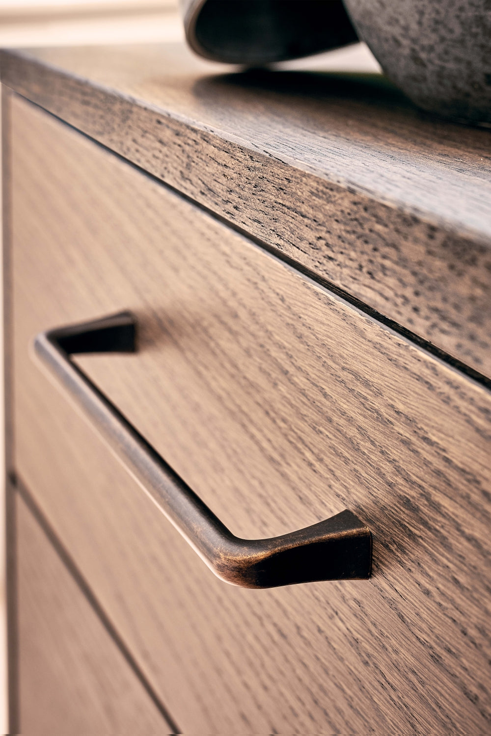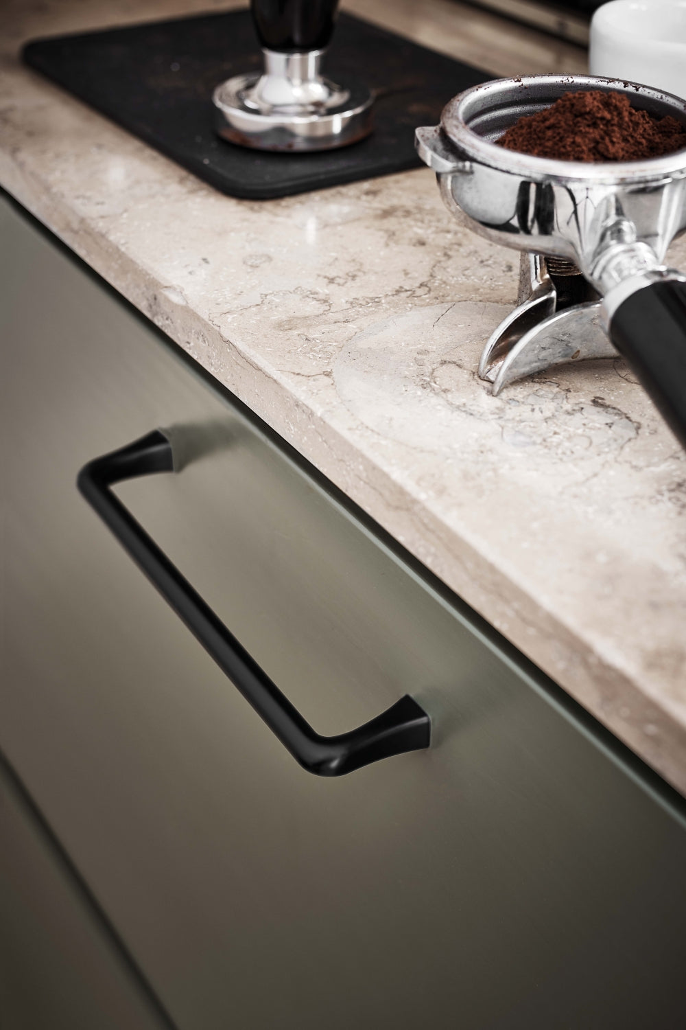 Kantet, men alligevel rundt. Skarpt, men blødt. Dynamisk, men stramt. Dette greb, der er designet af Hans Sandgren Jakobsen, er inspireret af et gammelt svensk greb til en skydedør. Designeren omfortolker det fantastiske messinghåndværk, hvor detaljerne og det kunstneriske udtryk danner basis. I dette greb er det rustikke udtryk gentænkt, og resultatet er et meget dansk design, der både er simpelt og designsikkert i sit udtryk. Et elegant og klassisk køkkengreb i moderne vintage-stil der giver dine skabe og skuffer et personligt touch.