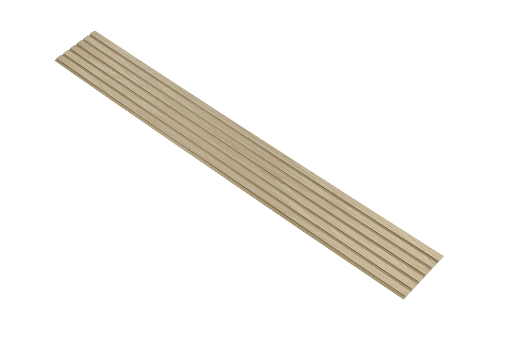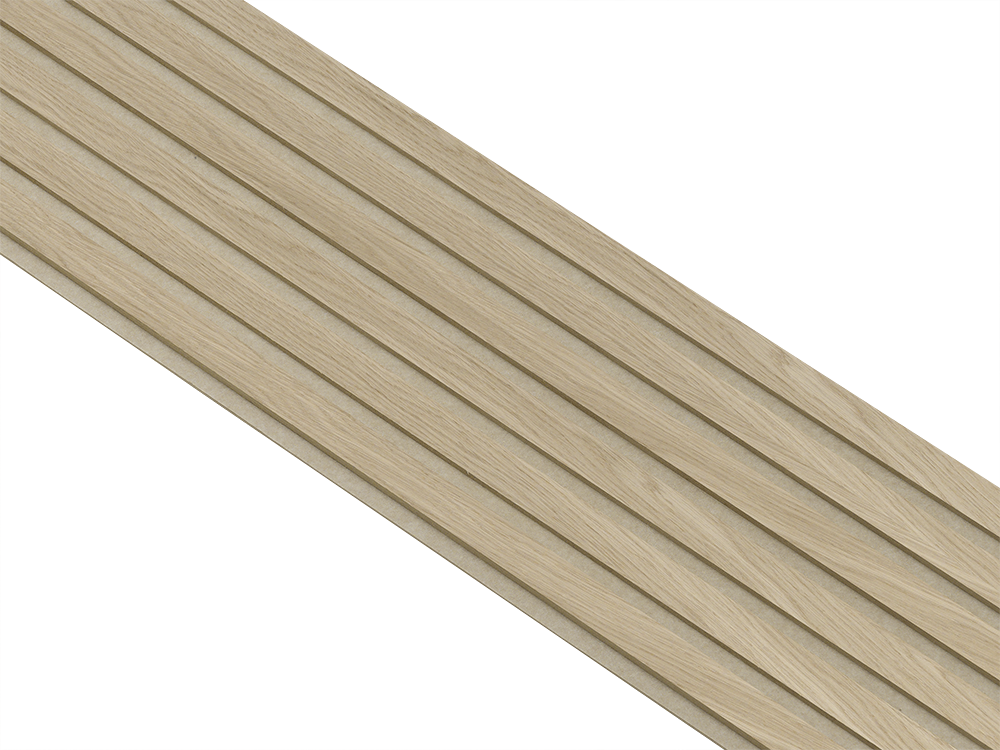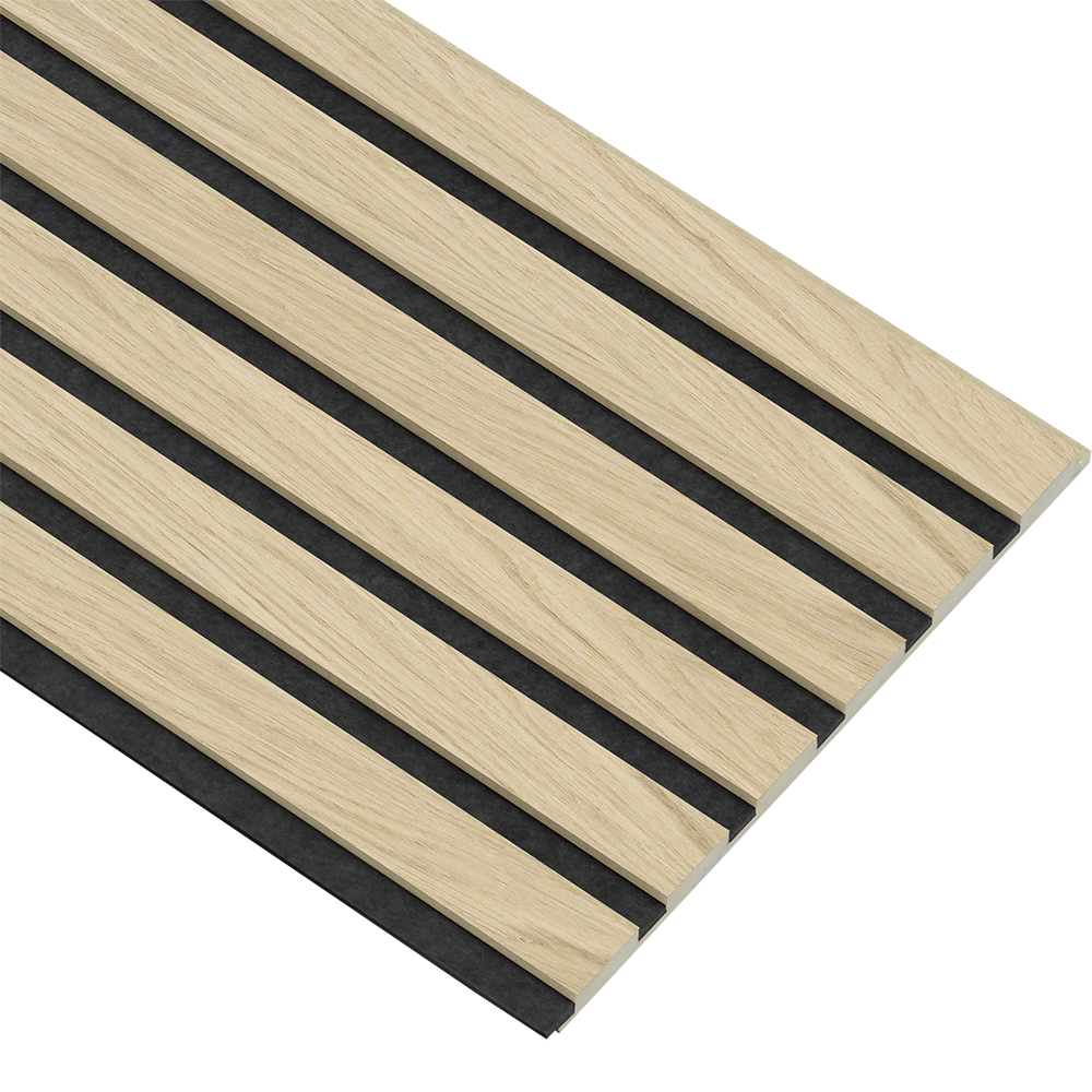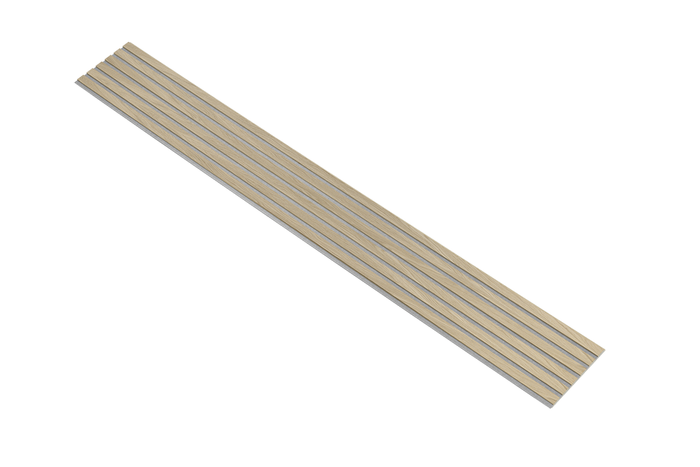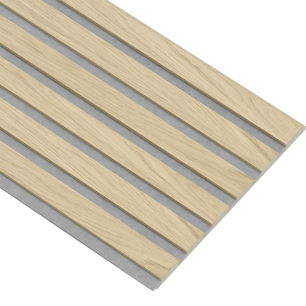 I-Wood Basic akustikpanel i MDF med egefinér og almindelig kerne. Panelet er natur (ubehandlet) med beige filt, der giver et lyst og varmt udtryk.