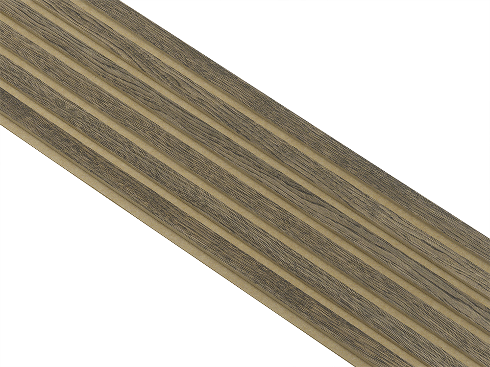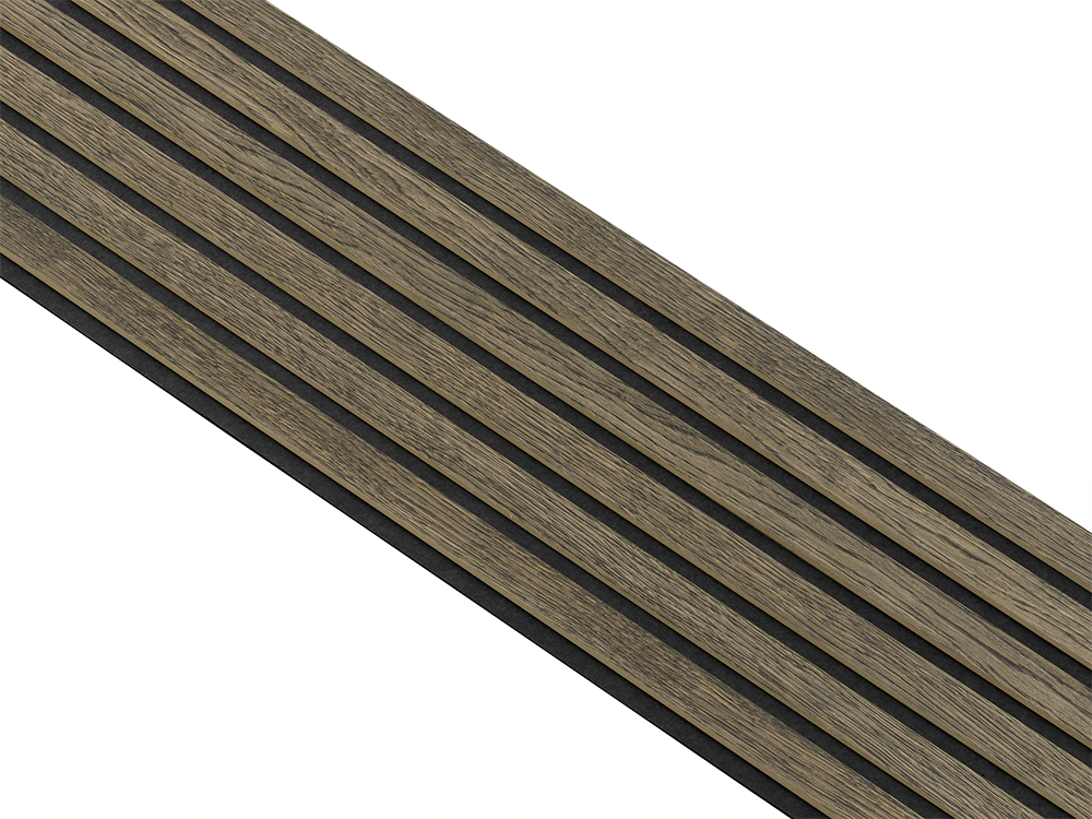 I-Wood Basic akustikpanel i MDF med egefinér og almindelig kerne. Panelet er sortolieret, hvilket giver en elegant og moderne finish. Den grå filt tilfører et roligt og tidløst præg, som passer ind i mange forskellige indretninger.
