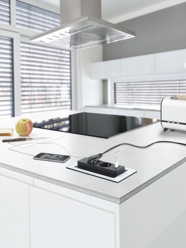 Denne BackFlip stikkontakt holder skrivebord, køkkenbord mv. fri for ledninger og er således med til at skabe rene lige linjer i indretningen.