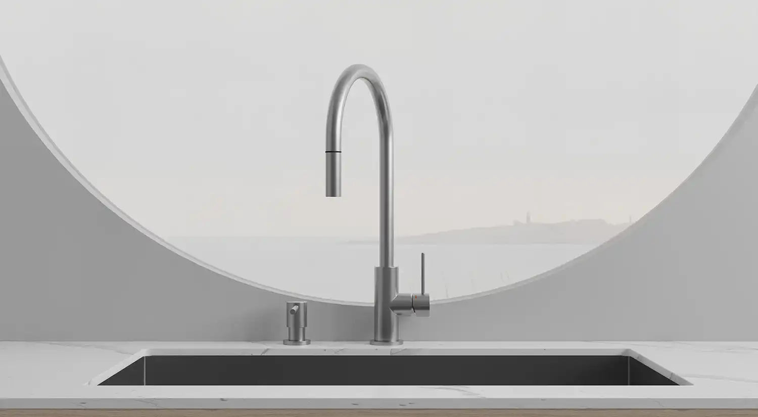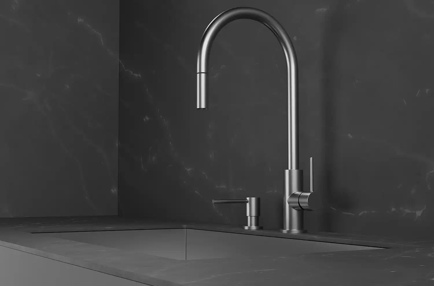 Primy Steel Accent er et køkkenbatteri i slankt og moderne design. Formgivet med en diskret, udtrækkelig dyse, der giver smidig rengøring.