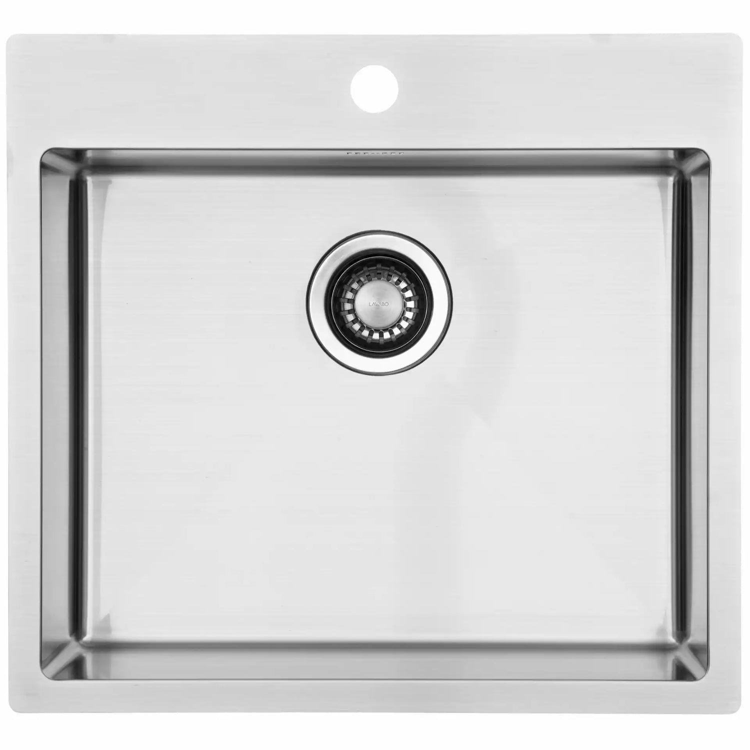 Rustfri stål køkkenvask, med hanehul, i et moderne firkantet design. De indvendige runde hjørner følger vaskens yderkant, hvilket giver et harmonisk design, ligeledes er de indvendige runde hjørner rengøringsvenlige.