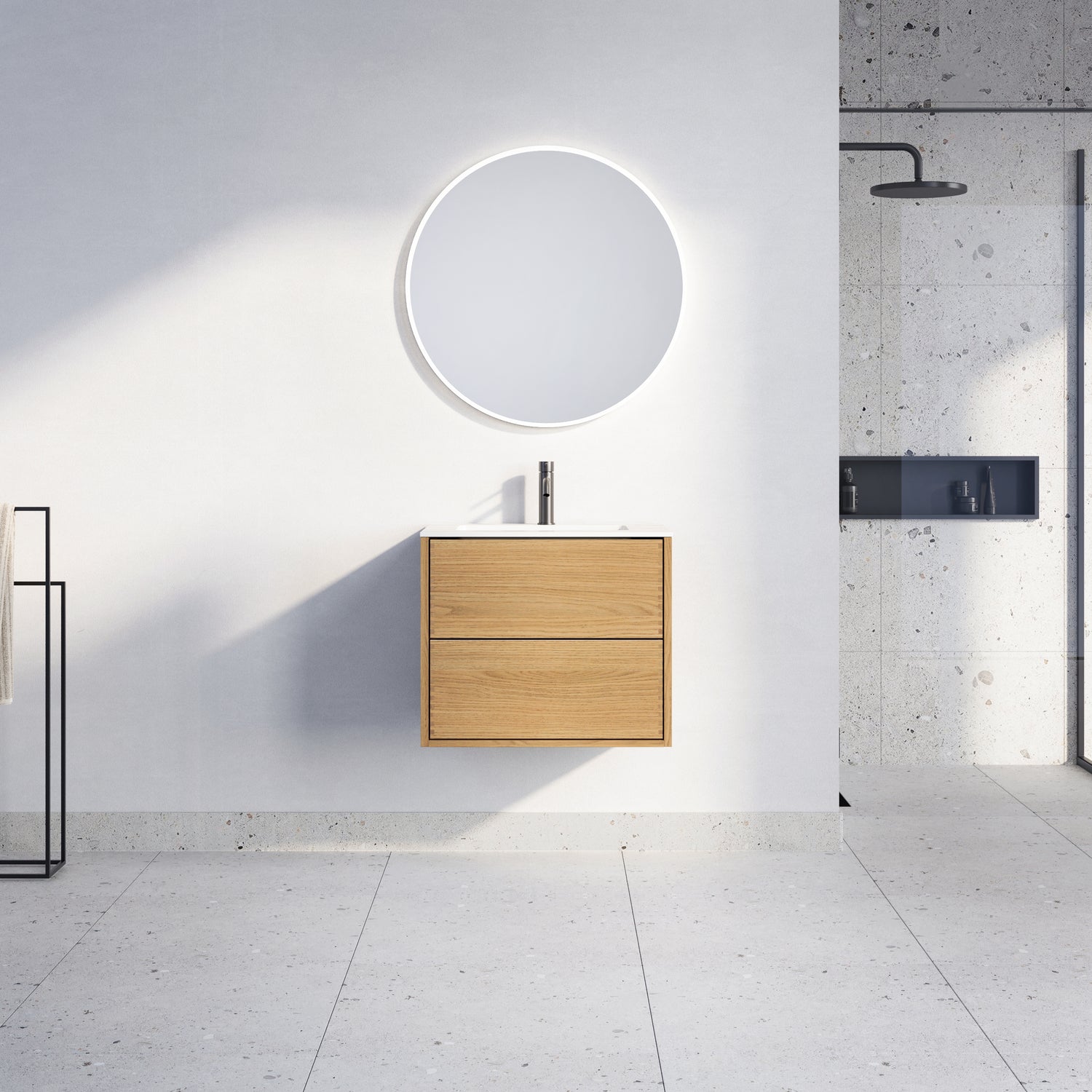 Her får du en Reno Solid Surface vask i mat hvid med centreret afløb, smukt forenet med det håndlavede Nordic Handcrafted vaskeskab i Natural Oak – et møbel, der udstråler kvalitet og ægthed i hver detalje.