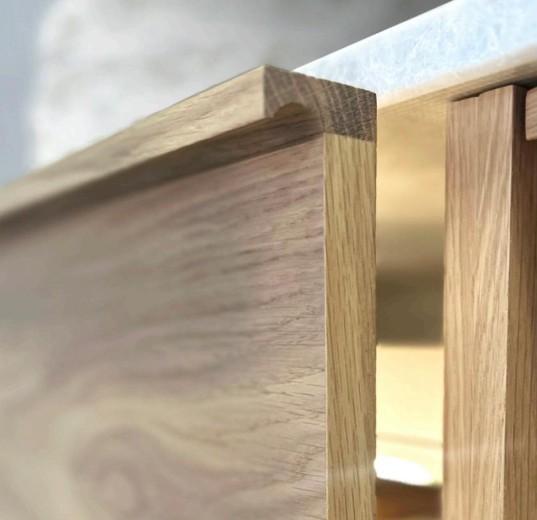 Dette elegante badskab er udført i lys egefiner med flotte greb i massiv eg, der giver et naturligt og tidløst udtryk. Skufferne er rummelige og funktionelle – den øverste med udskæring til vandlås for nem montering. Sort inderside med soft-close. inkl. antislibmåtte.