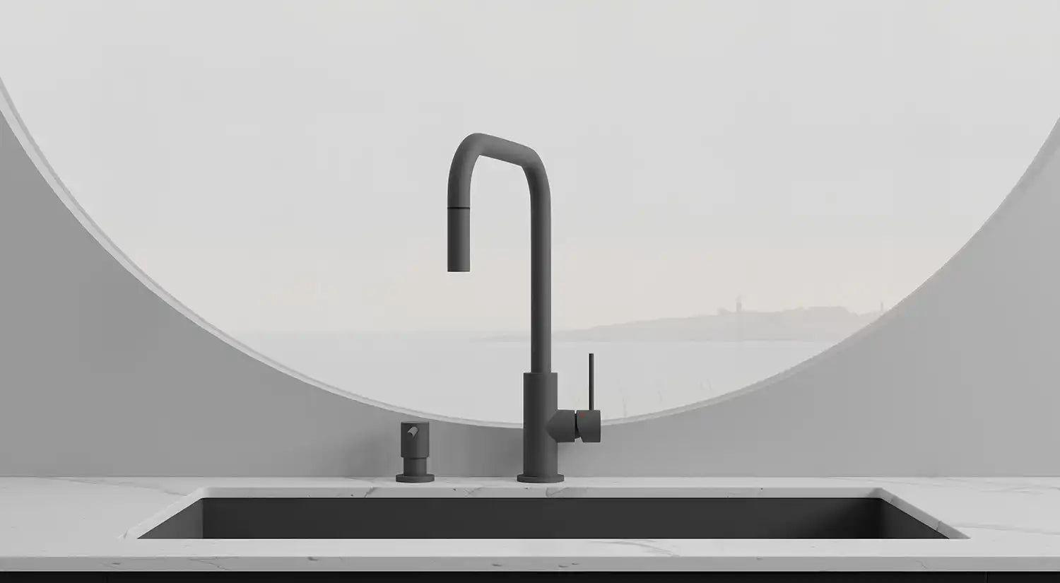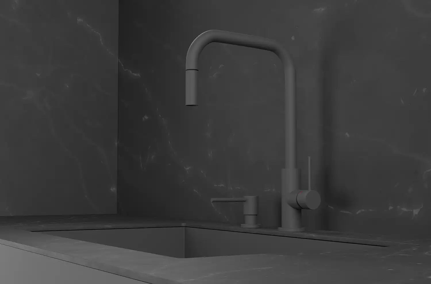 by Primy Accent Square er et køkkenbatteri i slankt design med udtrækkelig dyse. Designsproget er et samspil mellem bløde former og lige linjer, hvor elegance møder enkelhed.