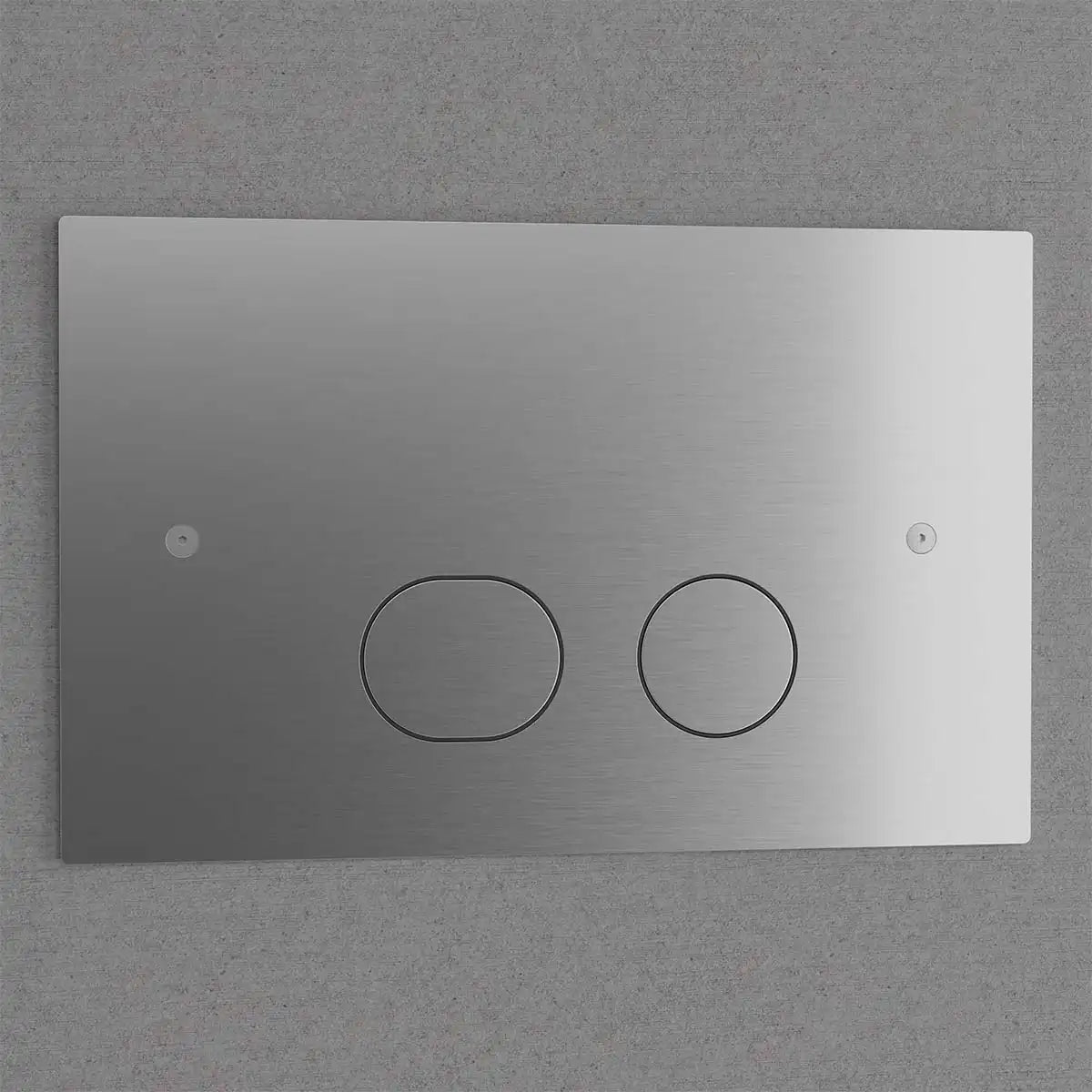 Betjeningsplade til indbygnings cisterne i elegant design med to stabile knapper til stort og lille skyl. Den slankere plade i massivt rustfrit stål giver et stilfuldt udtryk. Matcher det øvrige sortiment i farve og formsprog.