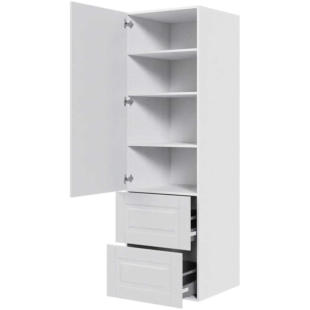 Et elegant og praktisk højskab, der kombinerer funktionalitet og kvalitet. Skabet har en rummelig låge øverst med god plads til opbevaring af alt fra service til husholdningsartikler. I bunden finder du to skuffer med fuldudtræk og softluk, som giver nem adgang og en lydløs lukning – perfekt til moderne hjem.