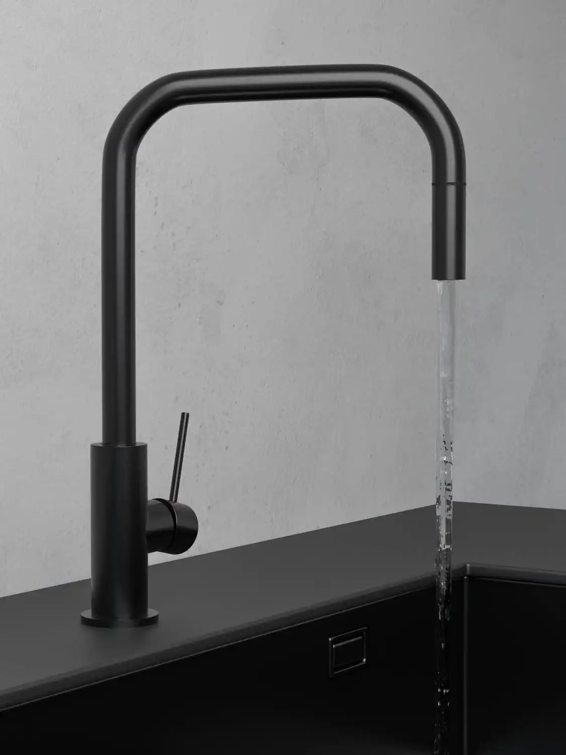Primy Steel Accent Square er et køkkenbatteri i slankt design med udtrækkelig dyse. Designsproget er et samspil mellem bløde former og lige linjer, hvor elegance møder enkelhed.